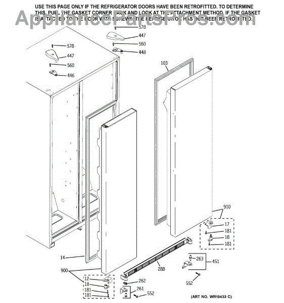 White plastic door stop plate installs on refrigerator cabinet to support door closure. Replace if cracked, broken, or missing to restore proper fit.