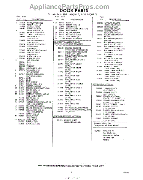 Parts for Whirlpool RDE1400W2: 05 - Door , Lit / Optional Parts