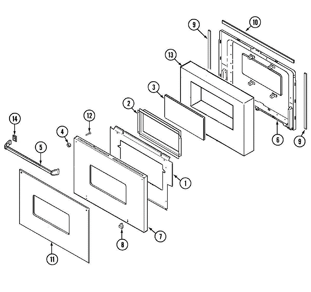 Outer door panel for gas wall ovens. Covers the exterior face of the oven door. Replace if cracked, dented, discolored, or damaged from impact.