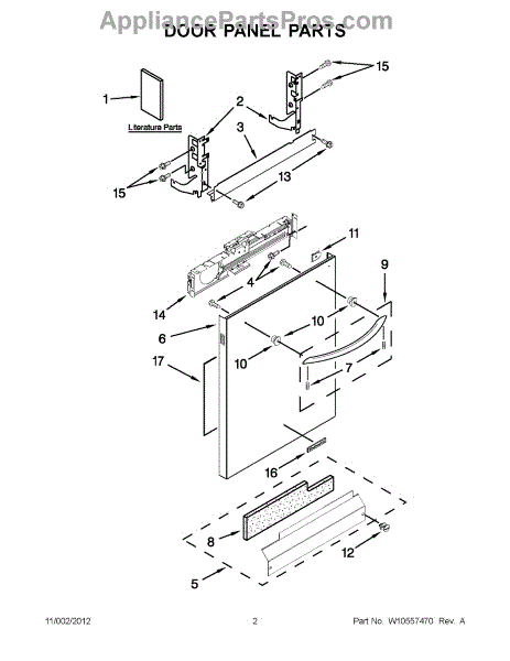 The Panel (BLK) is an OEM part for Whirlpool dishwashers. This black exterior panel is designed to provide a sleek and durable front surface for the dishwasher, enhancing its appearance and protecting internal components.