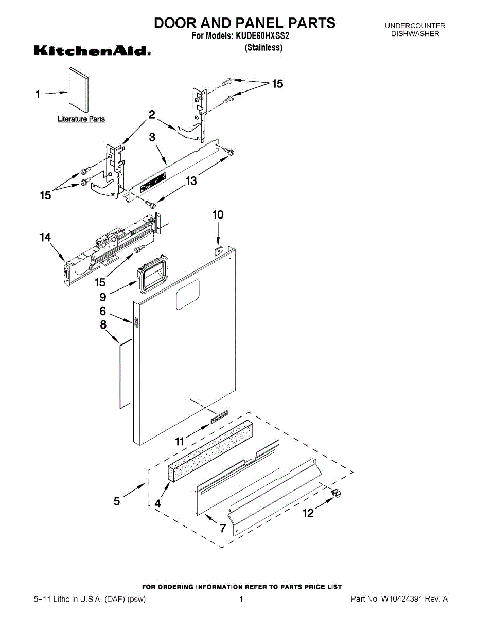 Dishwasher outer door panel. Replaces cracked, dented, or worn exterior panels. Attaches to the door frame with screws for a refreshed appearance.
