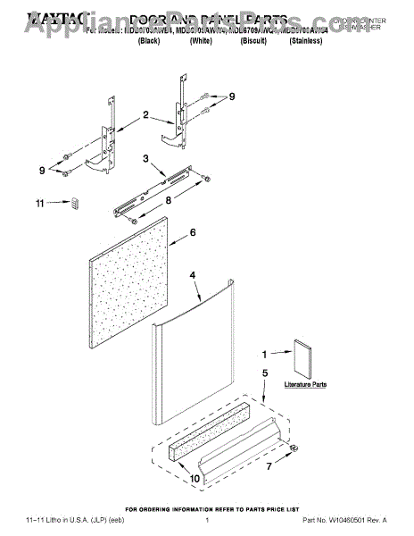 The Panel (BLK) is an OEM part for Whirlpool dishwashers. This black exterior panel is designed to provide a sleek and durable front surface for the dishwasher, enhancing its appearance and protecting internal components.