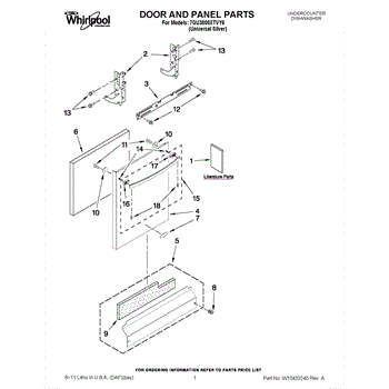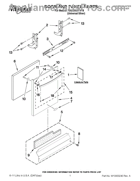The Panel (BLK) is an OEM part for Whirlpool dishwashers. This black exterior panel is designed to provide a sleek and durable front surface for the dishwasher, enhancing its appearance and protecting internal components.