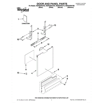 The Panel (BLK) is an OEM part for Whirlpool dishwashers. This black exterior panel is designed to provide a sleek and durable front surface for the dishwasher, enhancing its appearance and protecting internal components.