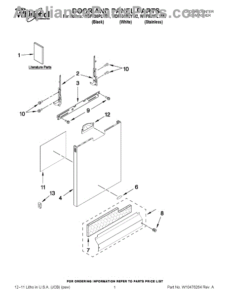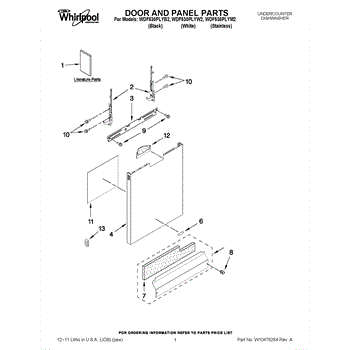 The Panel (BLK) is an OEM part for Whirlpool dishwashers. This black exterior panel is designed to provide a sleek and durable front surface for the dishwasher, enhancing its appearance and protecting internal components.