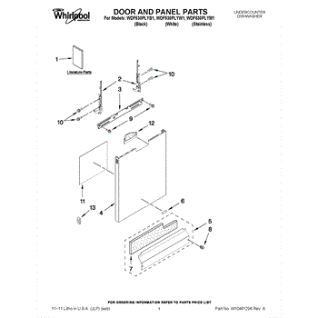 The Panel (BLK) is an OEM part for Whirlpool dishwashers. This black exterior panel is designed to provide a sleek and durable front surface for the dishwasher, enhancing its appearance and protecting internal components.