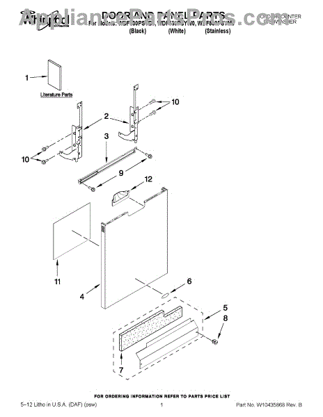 The Panel (BLK) is an OEM part for Whirlpool dishwashers. This black exterior panel is designed to provide a sleek and durable front surface for the dishwasher, enhancing its appearance and protecting internal components.