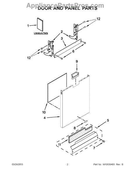 The Panel (BLK) is an OEM part for Whirlpool dishwashers. This black exterior panel is designed to provide a sleek and durable front surface for the dishwasher, enhancing its appearance and protecting internal components.