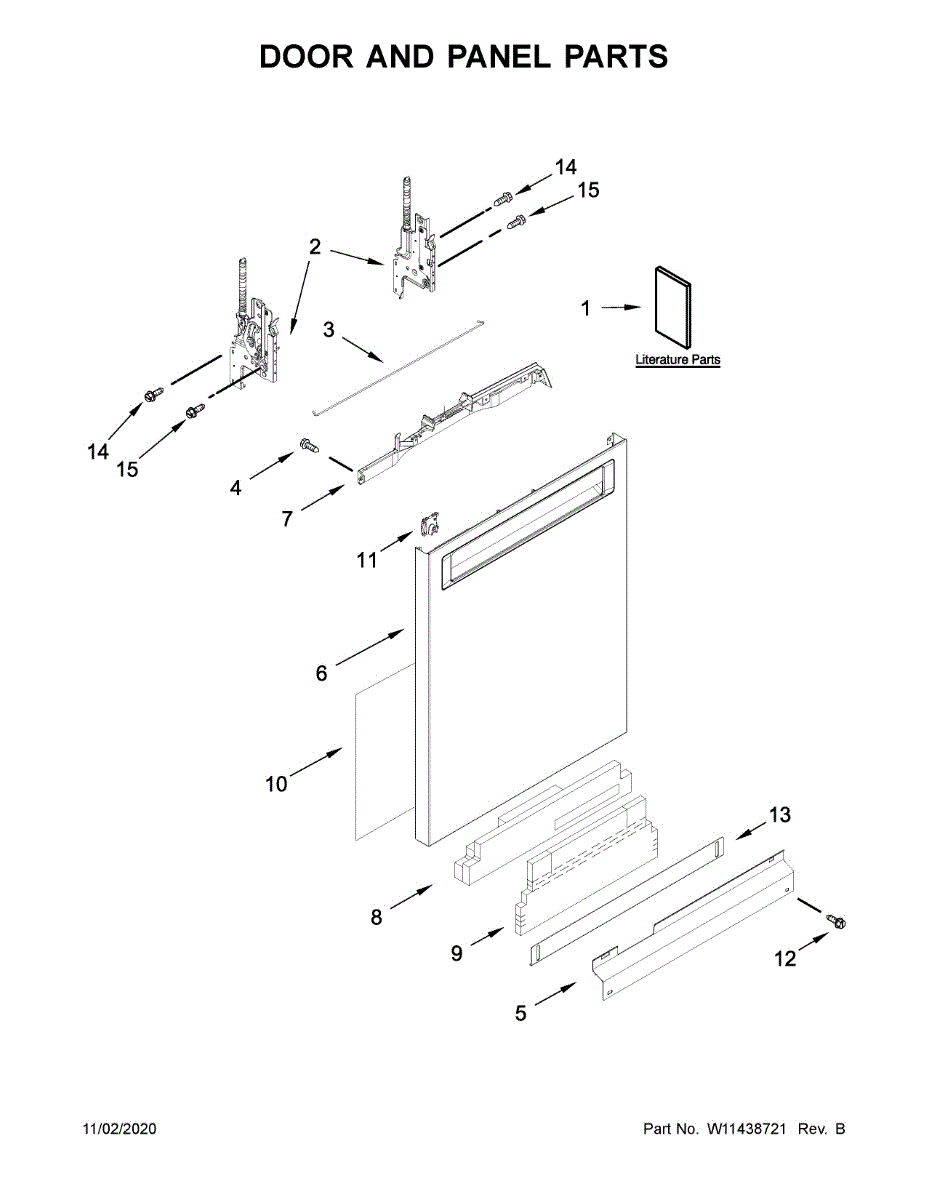 Outer cover trim piece for dishwasher door assembly. Replace this cosmetic trim if cracked, broken, or missing to restore a finished appearance.