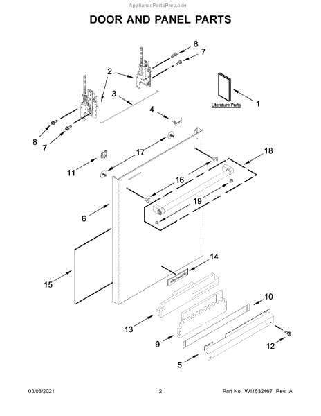The Access Panel is an OEM part for Whirlpool dishwashers. Located along the bottom front of the dishwasher, it serves the dual purpose of protecting the unit's exterior from kicks and impacts while allowing technicians interior access.