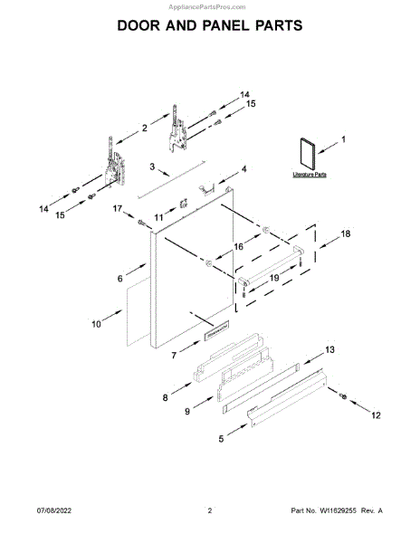 The Access Panel is an OEM part for Whirlpool dishwashers. Located along the bottom front of the dishwasher, it serves the dual purpose of protecting the unit's exterior from kicks and impacts while allowing technicians interior access.