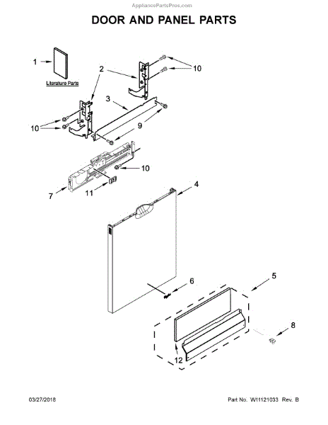 The Panel (BLK) is an OEM part for Whirlpool dishwashers. This black exterior panel is designed to provide a sleek and durable front surface for the dishwasher, enhancing its appearance and protecting internal components.