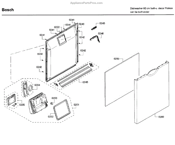 The Dishwasher Inner Door Panel is an OEM part for Bosch dishwashers. It is located inside the dishwasher door and protects internal components.