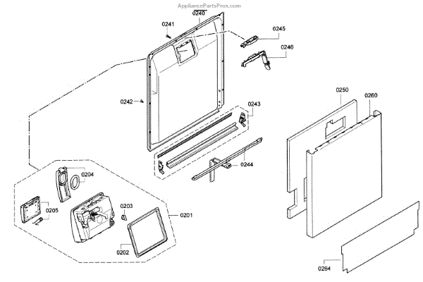 This inner door panel replaces a damaged or worn dishwasher door interior to restore proper door fit and help prevent leaks and rattling. It fits behind the outer door and supports the latch and internal components. What it does