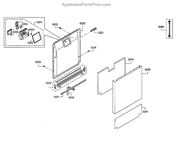 This inner door panel replaces a damaged or worn dishwasher door interior to restore proper door fit and help prevent leaks and rattling. It fits behind the outer door and supports the latch and internal components. What it does