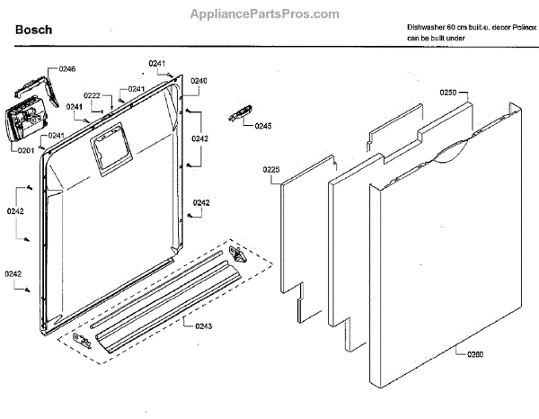 The Dishwasher Inner Door Panel is an OEM part for Bosch dishwashers. It is located inside the dishwasher door and protects internal components.