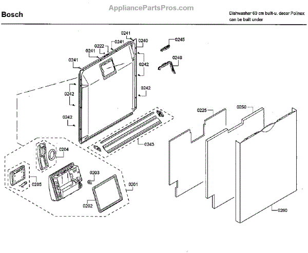 The Dishwasher Inner Door Panel is an OEM part for Bosch dishwashers. It is located inside the dishwasher door and protects internal components.