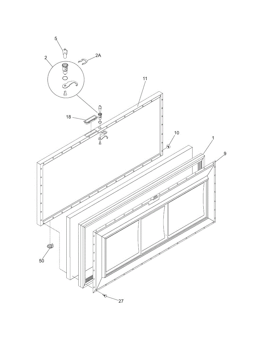 Inner door panel liner for chest freezers. Replaces cracked, warped, or broken interior door panels. Essential for maintaining proper door seal.