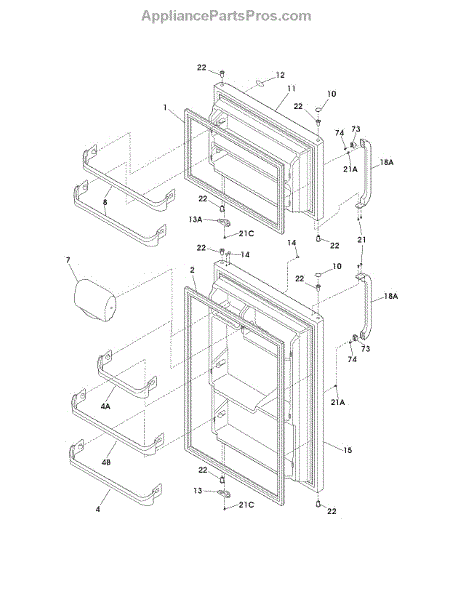 This door stop limits the opening angle of the refrigerator/freezer door to prevent overextension that can stress hinges or strike nearby cabinets. Replacing a worn or missing stop restores controlled door travel and helps prevent impact damage.