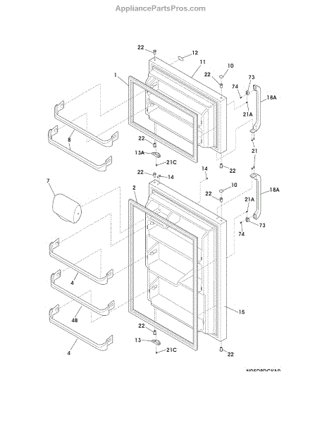 This door stop limits the opening angle of the refrigerator/freezer door to prevent overextension that can stress hinges or strike nearby cabinets. Replacing a worn or missing stop restores controlled door travel and helps prevent impact damage.