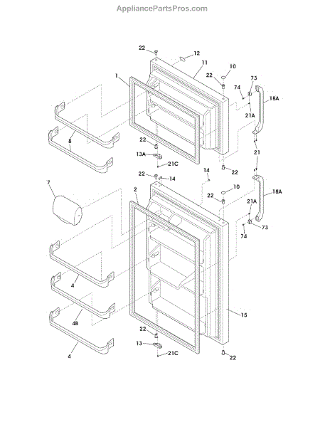 This door stop limits the opening angle of the refrigerator/freezer door to prevent overextension that can stress hinges or strike nearby cabinets. Replacing a worn or missing stop restores controlled door travel and helps prevent impact damage.