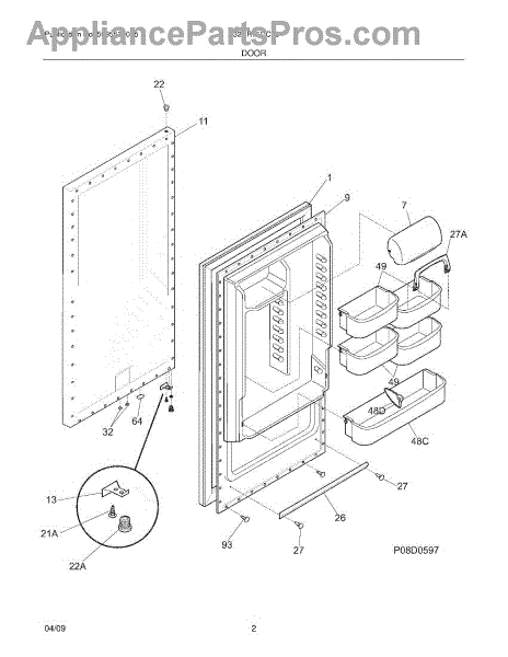 The Door Bin is an OEM replacement part for Frigidaire refrigerators. It provides interior storage by hanging securely inside the refrigerator door. The bin measures approximately 13 inches wide at its longest point, 5 inches deep, and 4 inches tall. Causes of a bad door bin can include damage from overloading or improper handling. The plastic material can become cracked or warped from stress over time. Symptoms of a failed door bin include: