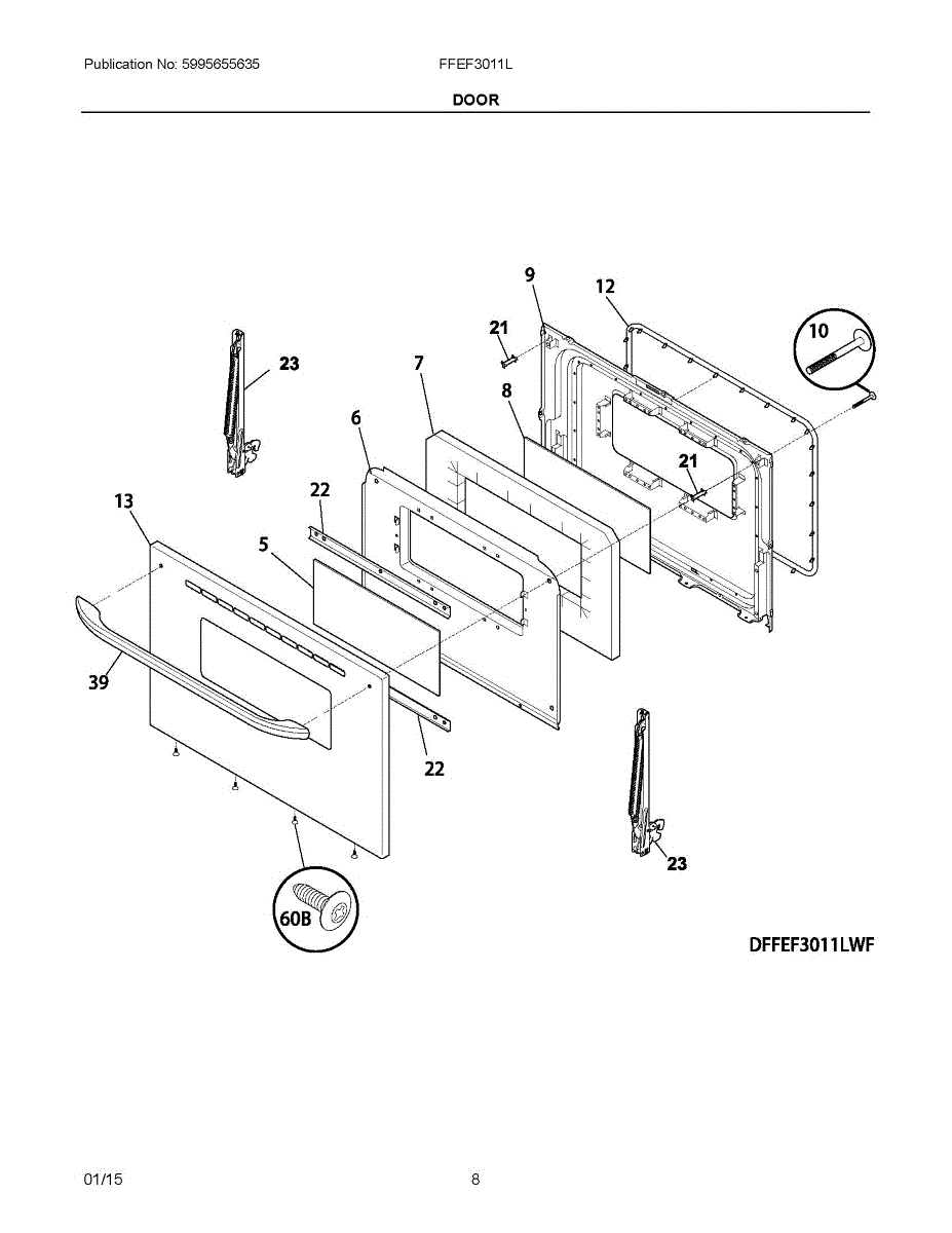 Mounting screw for range oven door handles. Secures the handle to the door panel. Replace when stripped, corroded, missing, or if handle is loose.