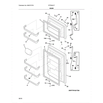Complete outer freezer door panel assembly for top-mount refrigerators. Replaces cracked, dented, or cosmetically damaged door shells to restore appearance.