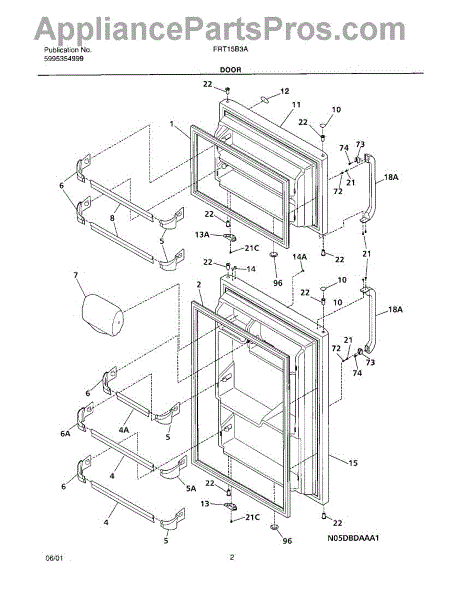 This door stop limits the opening angle of the refrigerator/freezer door to prevent overextension that can stress hinges or strike nearby cabinets. Replacing a worn or missing stop restores controlled door travel and helps prevent impact damage.