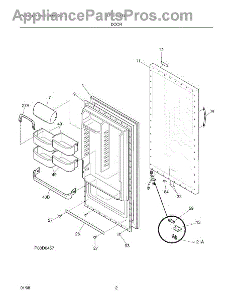 The Door Bin is an OEM replacement part for Frigidaire refrigerators. It provides interior storage by hanging securely inside the refrigerator door. The bin measures approximately 13 inches wide at its longest point, 5 inches deep, and 4 inches tall. Causes of a bad door bin can include damage from overloading or improper handling. The plastic material can become cracked or warped from stress over time. Symptoms of a failed door bin include:
