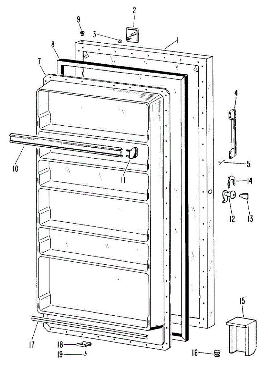 Hardware fasteners for securing refrigerator door panels and components. Includes screws, nuts, and washers for assembly. Replace missing or stripped pieces.