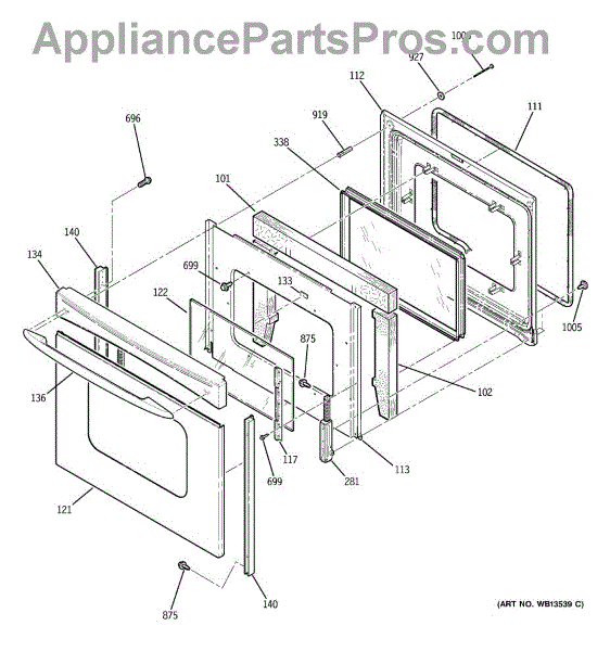 The Oven Door Window Pack Assembly is an OEM part for GE ovens. This assembly includes the glass window and necessary components to ensure a clear view into the oven while maintaining the internal temperature and providing insulation. The glass measures 19" x 12".