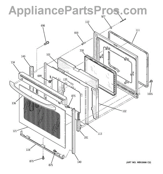 The Oven Door Window Pack Assembly is an OEM part for GE ovens. This assembly includes the glass window and necessary components to ensure a clear view into the oven while maintaining the internal temperature and providing insulation. The glass measures 19" x 12".