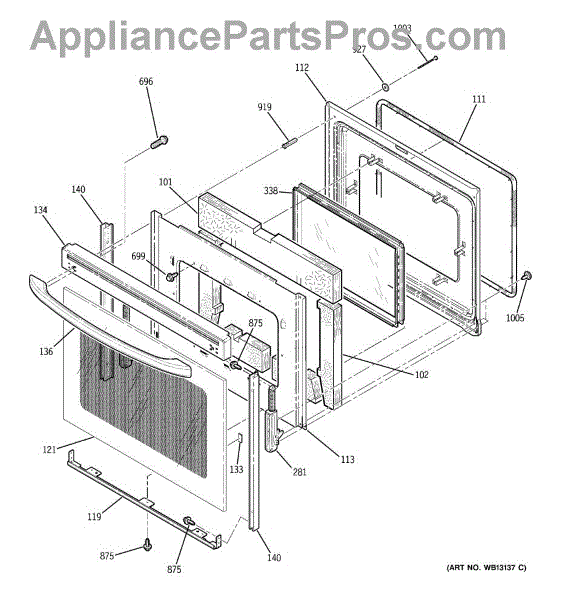 The Oven Door Window Pack Assembly is an OEM part for GE ovens. This assembly includes the glass window and necessary components to ensure a clear view into the oven while maintaining the internal temperature and providing insulation. The glass measures 19" x 12".