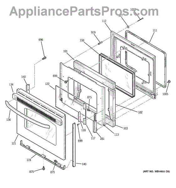 Inner oven door glass installs inside the door cavity behind the outer panel. Replace if shattered, cracked, or broken to restore viewing window function.