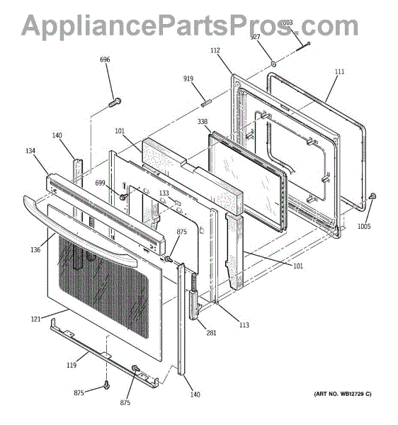 The Oven Door Window Pack Assembly is an OEM part for GE ovens. This assembly includes the glass window and necessary components to ensure a clear view into the oven while maintaining the internal temperature and providing insulation. The glass measures 19" x 12".