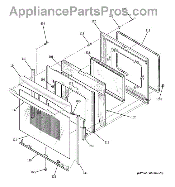 The Oven Door Window Pack Assembly is an OEM part for GE ovens. This assembly includes the glass window and necessary components to ensure a clear view into the oven while maintaining the internal temperature and providing insulation. The glass measures 19" x 12".