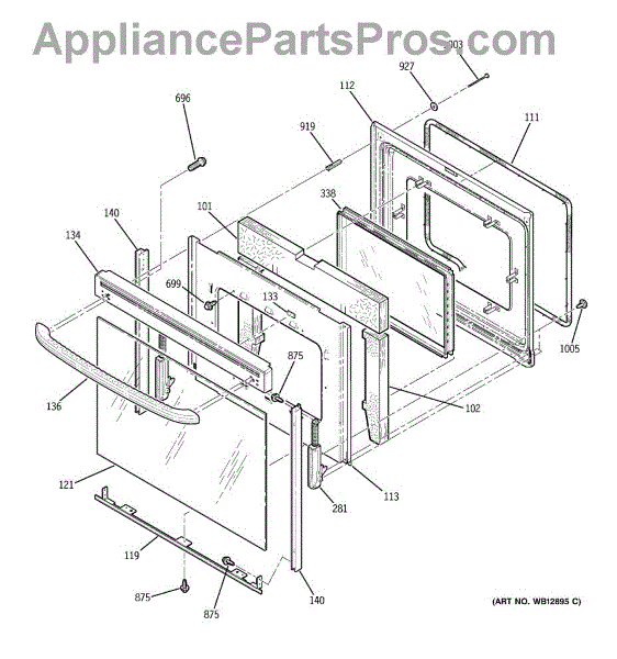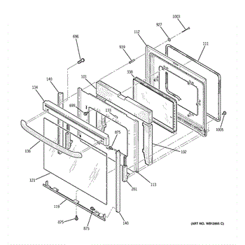 The Oven Door Window Pack Assembly is an OEM part for GE ovens. This assembly includes the glass window and necessary components to ensure a clear view into the oven while maintaining the internal temperature and providing insulation. The glass measures 19" x 12".