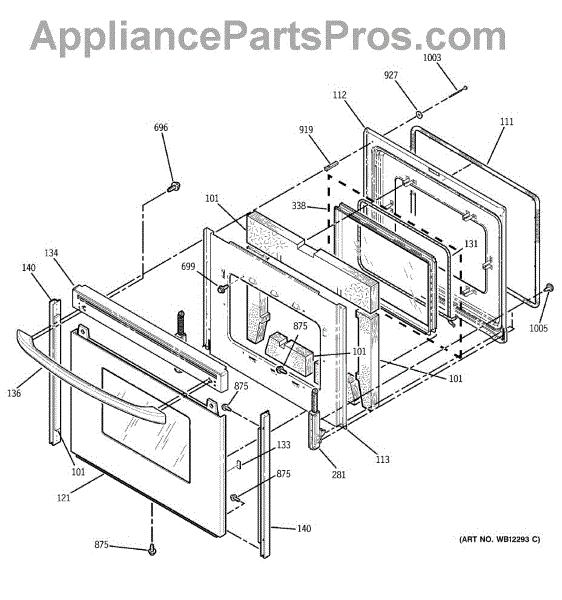 The Oven Door Window Pack Assembly is an OEM part for GE ovens. This assembly includes the glass window and necessary components to ensure a clear view into the oven while maintaining the internal temperature and providing insulation. The glass measures 19" x 12".