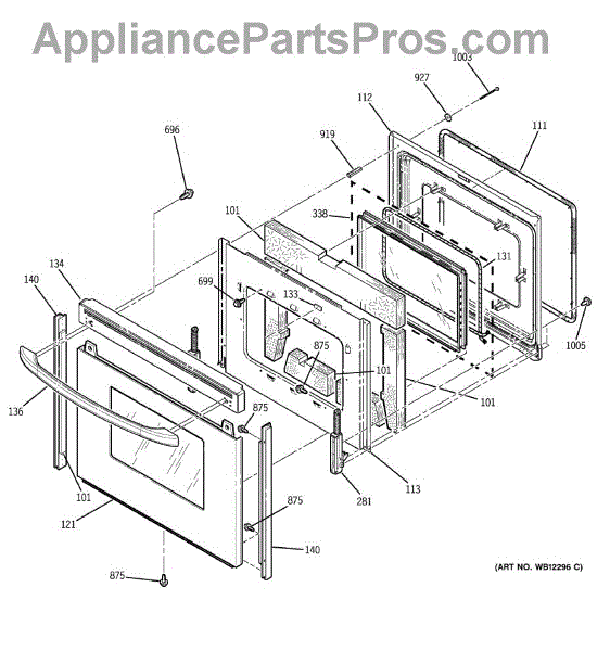 The Oven Door Window Pack Assembly is an OEM part for GE ovens. This assembly includes the glass window and necessary components to ensure a clear view into the oven while maintaining the internal temperature and providing insulation. The glass measures 19" x 12".