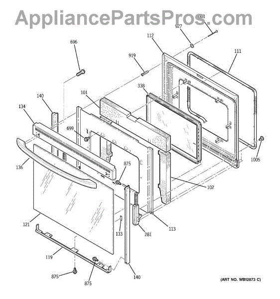The Oven Door Window Pack Assembly is an OEM part for GE ovens. This assembly includes the glass window and necessary components to ensure a clear view into the oven while maintaining the internal temperature and providing insulation. The glass measures 19" x 12".