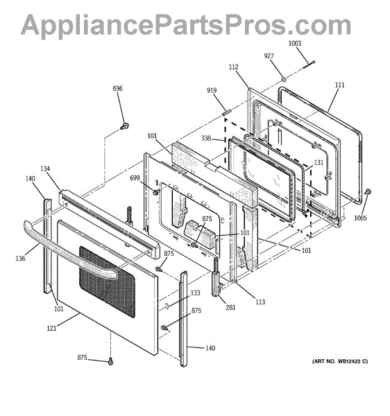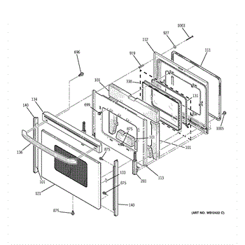The Oven Door Window Pack Assembly is an OEM part for GE ovens. This assembly includes the glass window and necessary components to ensure a clear view into the oven while maintaining the internal temperature and providing insulation. The glass measures 19" x 12".
