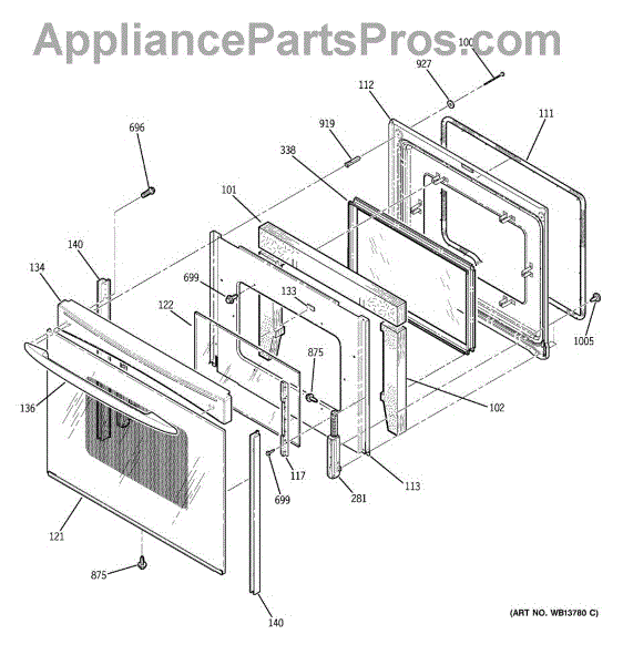 The Oven Door Window Pack Assembly is an OEM part for GE ovens. This assembly includes the glass window and necessary components to ensure a clear view into the oven while maintaining the internal temperature and providing insulation. The glass measures 19" x 12".