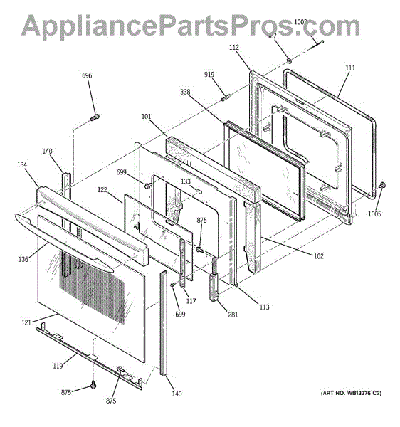 The Oven Door Window Pack Assembly is an OEM part for GE ovens. This assembly includes the glass window and necessary components to ensure a clear view into the oven while maintaining the internal temperature and providing insulation. The glass measures 19" x 12".