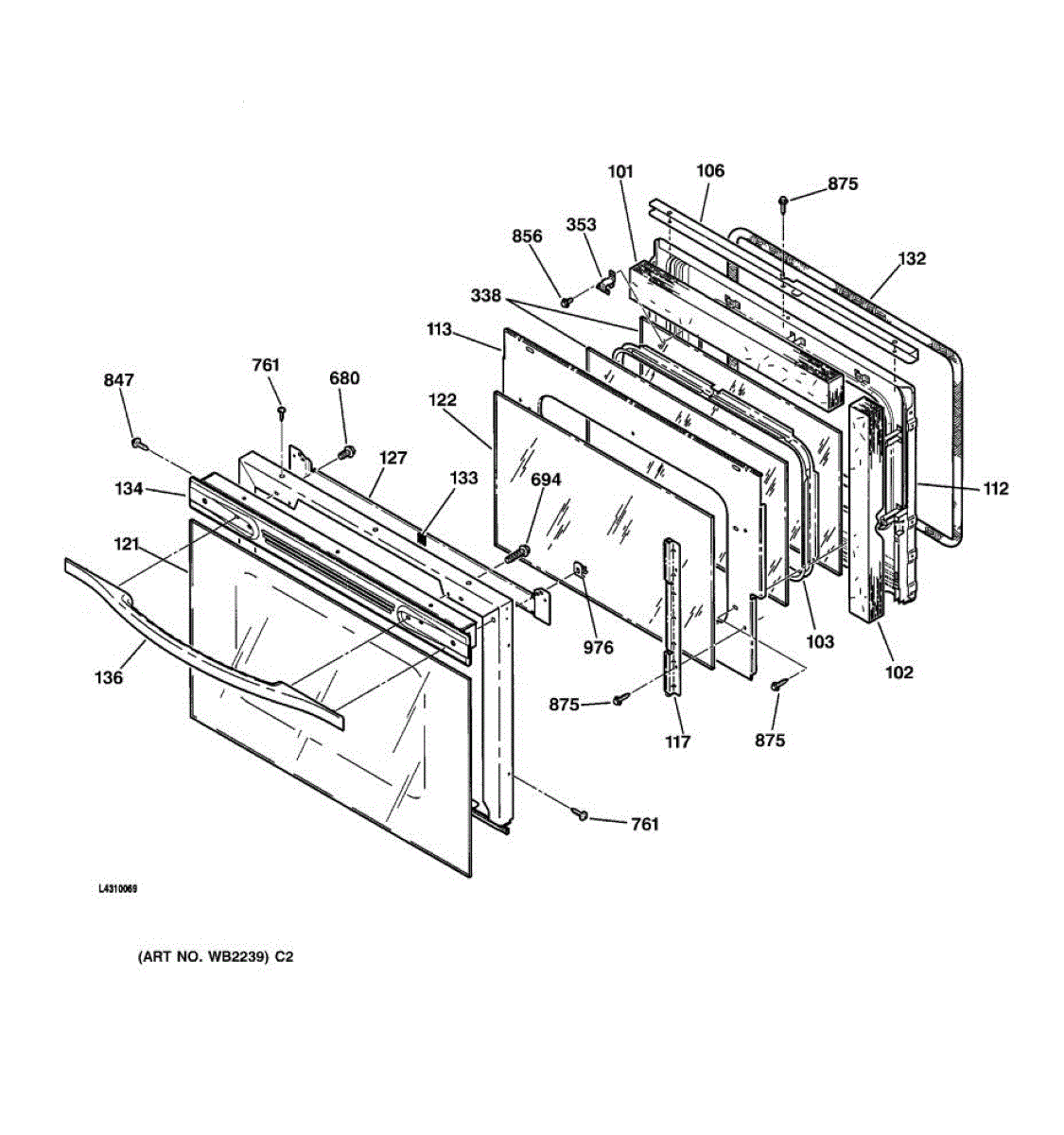 Inner oven door glass installs inside the door cavity behind the outer panel. Replace if shattered, cracked, or broken to restore viewing window function.