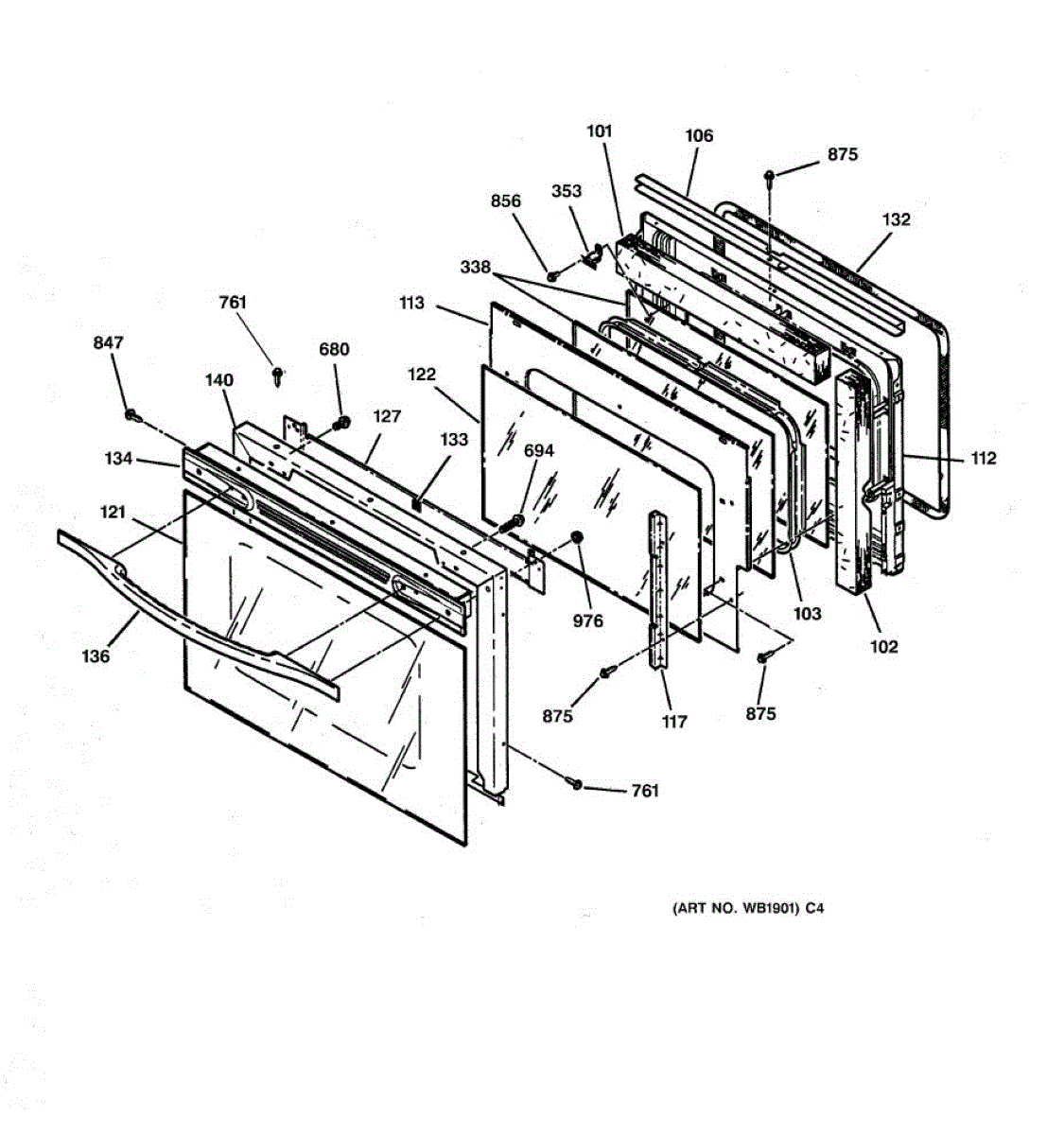 Inner oven door glass installs inside the door cavity behind the outer panel. Replace if shattered, cracked, or broken to restore viewing window function.