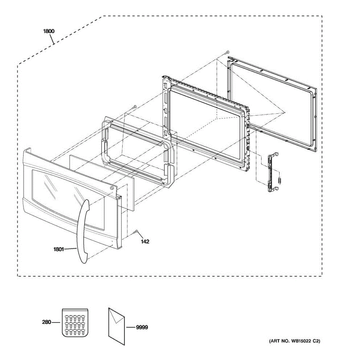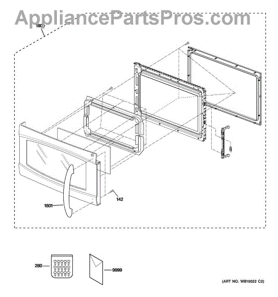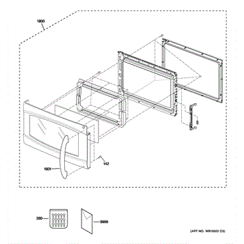 Replacement microwave door assembly that restores outer panel structure and appearance. Needed when door is cracked, dented, warped, or damaged.