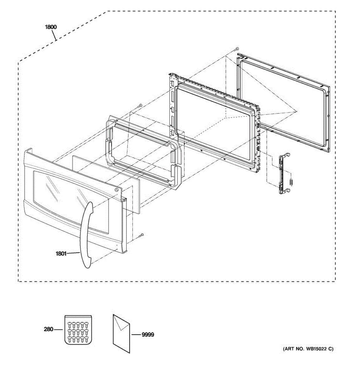 Replacement microwave door assembly that restores outer panel structure and appearance. Needed when door is cracked, dented, warped, or damaged.