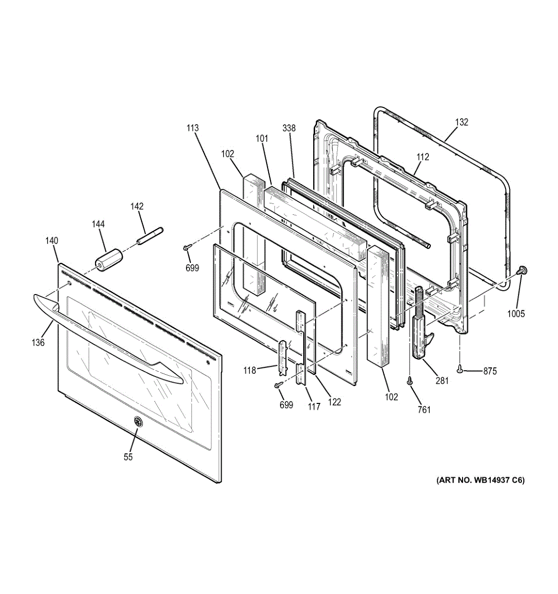 Inner oven door glass installs inside the door cavity behind the outer panel. Replace if shattered, cracked, or broken to restore viewing window function.