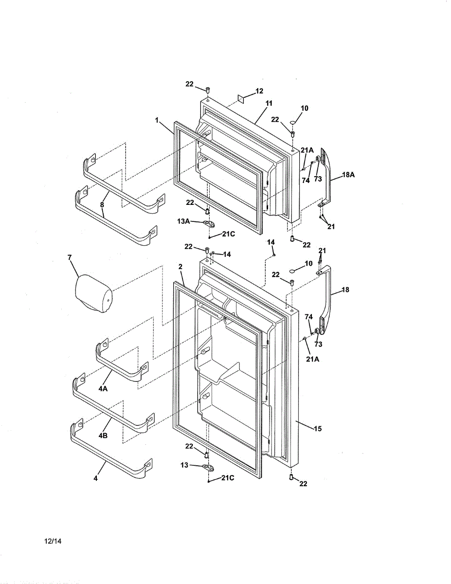 Complete refrigerator door assembly for top-mount models. Replacement needed when door is cracked, damaged, warped, or seals are permanently worn.
